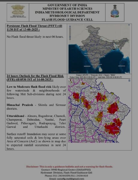 अगले 24 घंटों के दौरान निम्न मौसम उप-विभागों के कुछ जलग्रहण क्षेत्रों एवं आसपास के इलाकों में कम से मध्यम स्तर का फ्लैश फ्लड (अचानक बाढ़) जोखिम रहने की संभावना है।