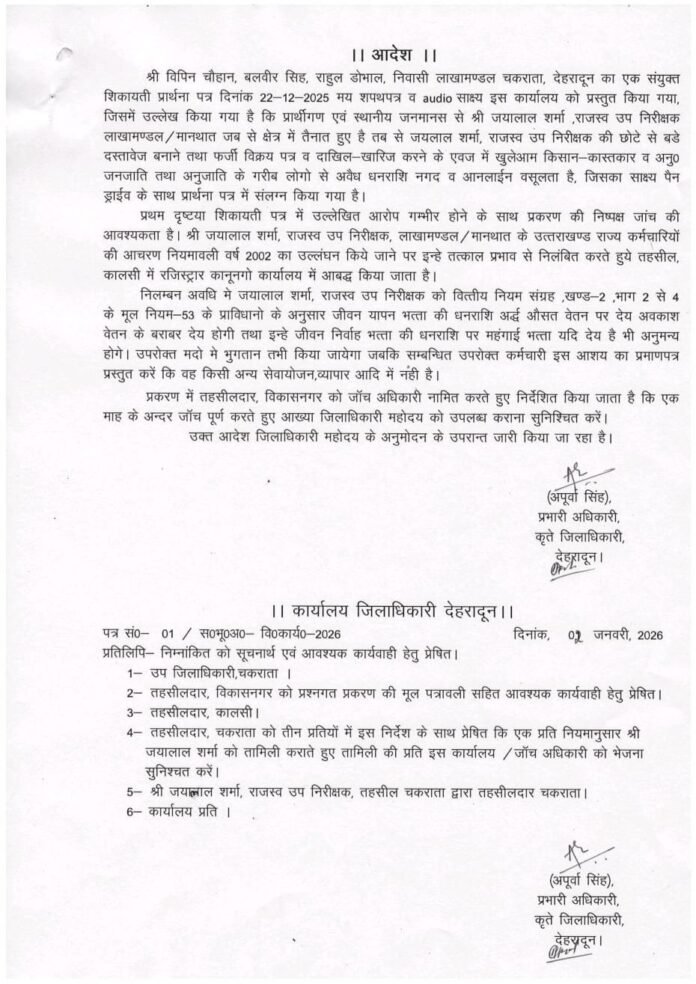 देहरादून: देहरादून जिले के चकराता क्षेत्र स्थित लाखामण्डल में तैनात राजस्व उप निरीक्षक जयालाल शर्मा को गंभीर भ्रष्टाचार के आरोपों के बाद तत्काल प्रभाव से निलंबित कर दिया गया है। यह कार्रवाई स्थानीय निवासियों की शिकायत पर की गई, जिसमें ऑडियो साक्ष्य भी शामिल हैं।